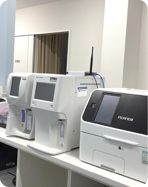 15分ほどで血球検査(貧血や炎症の有無がわかります)、ヘモグロビンA1c(糖尿病の診断にもちいられます)が測定できます。尿検査では膀胱炎などの尿路感染の診断も可能です。